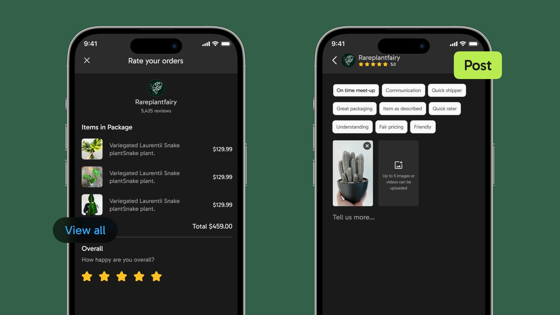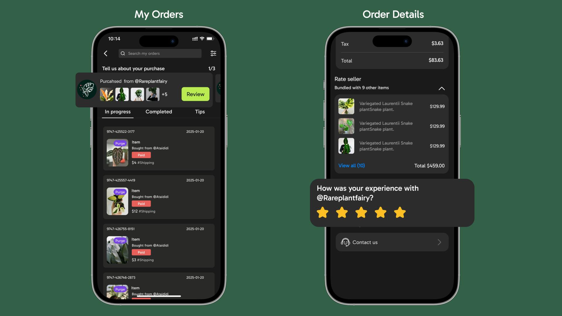Rate the order by package from a seller. Tap “View all” to see the items included in the package.
