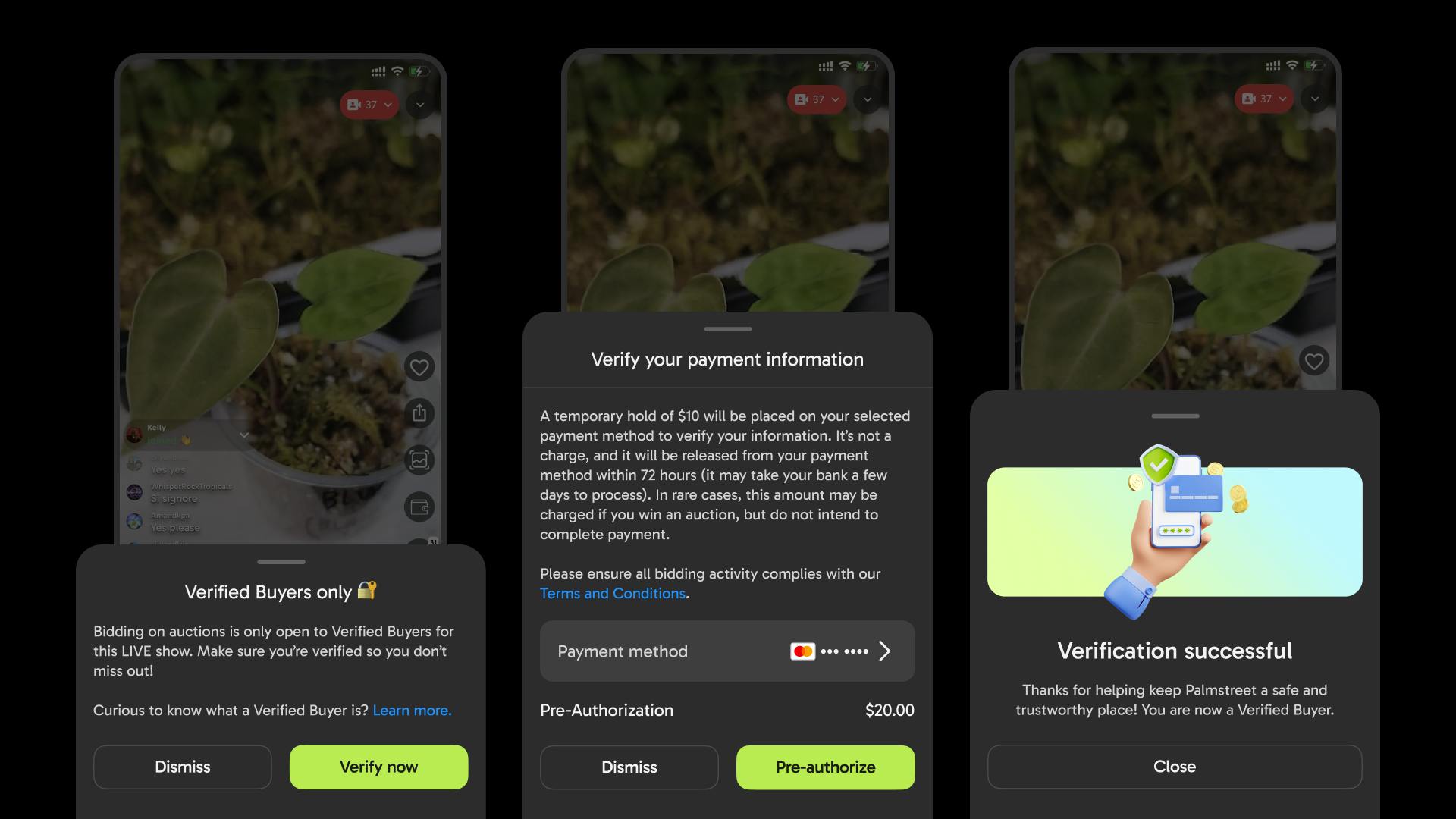 Verified Buyer status is designed to foster trust, accountability, and a seamless shopping experience on Palmstreet. Verification ensures that all participants are prepared to engage responsibly and complete transactions reliably. By verifying a valid payment method, buyers gain access to bidding in auctions—while helping maintain a safe and transparent environment for the entire community.