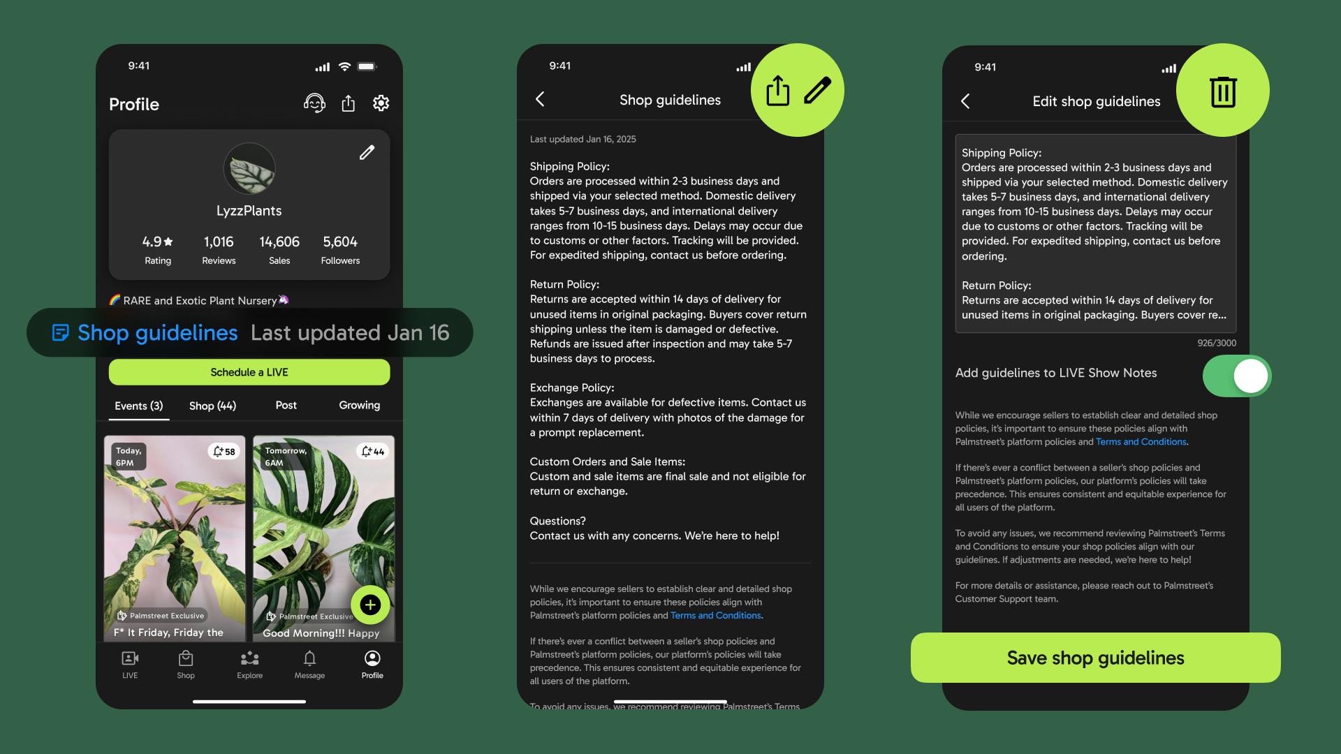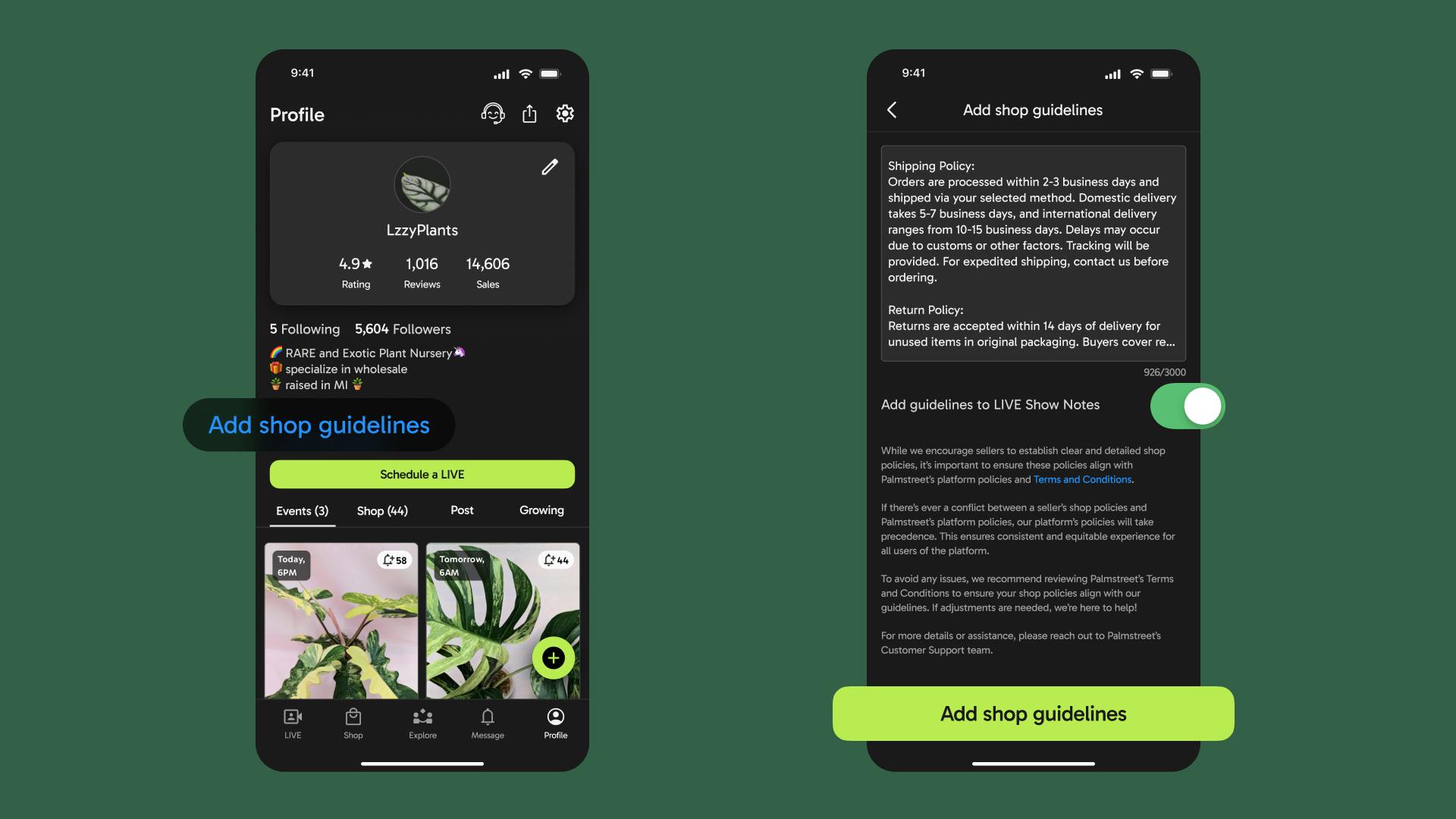 Shop guidelines can be added directly from the Profile page. Policies can be created and customized based on shop needs.