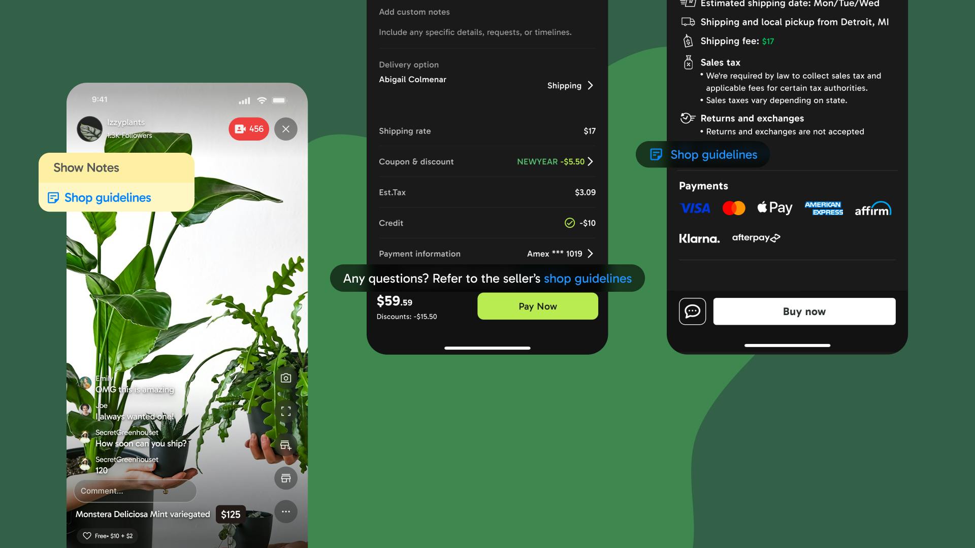 Shop guidelines can be accessed by buyers across multiple touchpoints, including LIVE show notes, the LIVE show/Purge Checkout page, and Marketplace Listing detail pages.